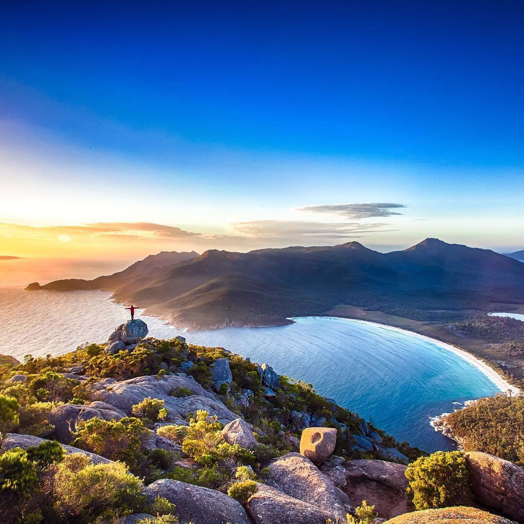 要到達酒杯灣(Wineglass Bay)觀景處就要經歷艱辛的旅途,但白色海灘、翠綠地峽和蔚藍海水形成一條弧線,從高處遠望的景色絕美。